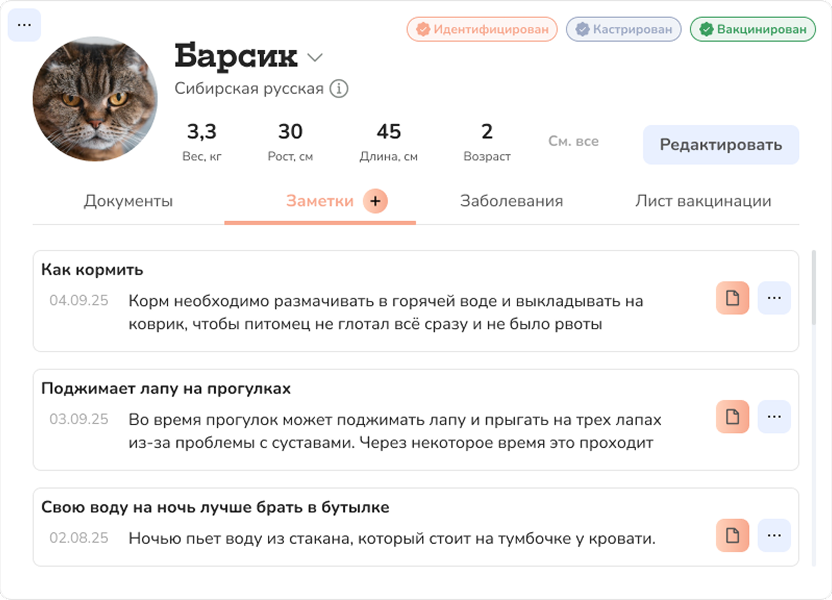 Ваши заметки об особенностях питомца помогут родственнику, ситтеру или выгульщику знать о всех нюансах, чтобы происшествий не случилось пока вас нет