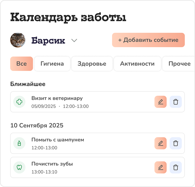 Напоминания из "Календаря заботы" помогут Вам не забыть вовремя заказать товары для питомца, записаться на груминг, почистить зубы и прочее
